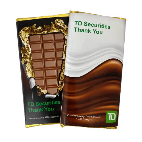 Our custom chocolate bar wrappers are the perfect way to promote your business and leave a lasting impression on your clients. These high-quality wrappers are fully customizable with your company’s logo, branding, and message. They are a delicious and unique way to say thank you to clients, and employees, or as a promotional giveaway at events. We offer a wide range of chocolate flavors and packaging options to suit your needs. Contact us to discuss your specific requirements. Our 100g bars are available in Milk, Dark, White, and Ruby chocolate.