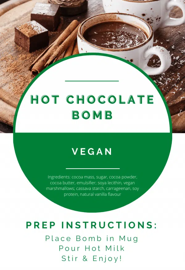 Ingredients: cocoa mass, sugar, cocoa powder, cocoa butter, emulsifier; soya lecithin, vegan marshmallows; cassava starch, carrageenan, soy protein, natural vanilla flavour