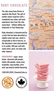 Ruby Chocolate – a true gift from nature! Our 50g ruby chocolate offers an intense sensorial delight, a totally new taste experience: neither bitter, milky or sweet, but a tension of fresh berry fruitiness.