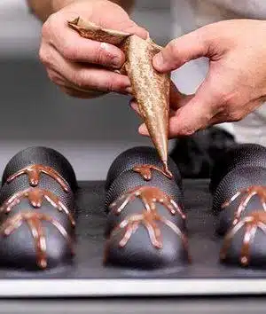 - Form your truffles and place on a fork (do not pierce the truffle), now dip it in the molten chocolate and then place it in the pyrex form. Wait about 40 seconds before kicking the form back and forth until the truffle is completely covered with cocoa.
